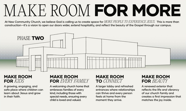 The New Community Church building was constructed over 20 years ago as Phase One of an original vision that included multiple Phases with upgrades to the facility and property. We have seen exponential growth both spiritually and numerically, and our current building does not have enough space to contain it all. Due to this, we have been feeling the need to expand our facilities. After countless months of prayer and seeking the Lord, our leadership believes that He is calling us to begin Phase Two of that original vision to Make Room For More!
